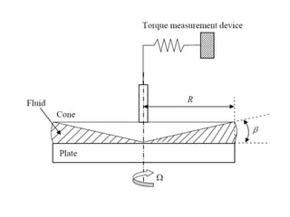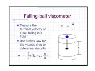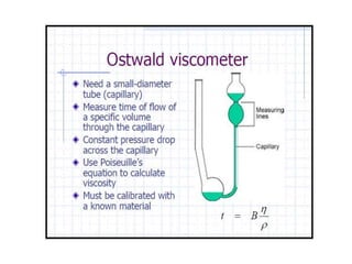 The document provides a comprehensive overview of viscosity, including its definition, measurement methods, and behavior of different fluid types. It distinguishes between Newtonian and non-Newtonian fluids, describing various categories such as pseudoplastic and dilatant fluids, along with the principles of viscosity measurement using instruments like viscometers. Additionally, it discusses how viscosity is affected by temperature and pressure, and outlines the importance of viscosity measurement in various practical applications.