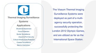 The document highlights the advanced features and specifications of the Viseum thermal imaging surveillance system, showcasing its applications in security and surveillance across various environments. It compares the Viseum system against FLIR's offerings, emphasizing advantages such as lower weight, better sealing (IP67), and superior performance metrics like faster pan/tilt speeds and longer detection range. The conclusion notes that Viseum's technology is rugged, suitable for all-weather conditions, and integrates with other systems for enhanced capabilities.