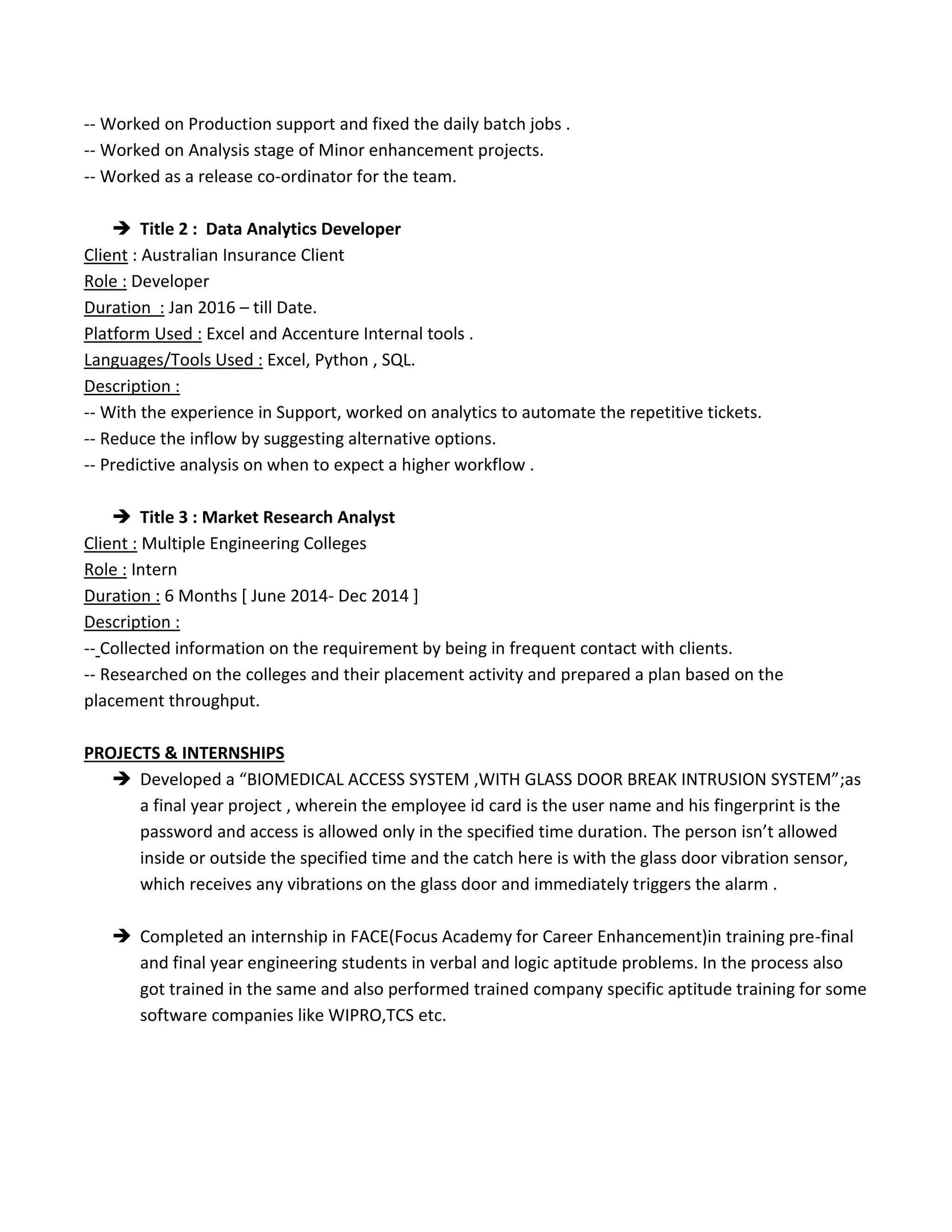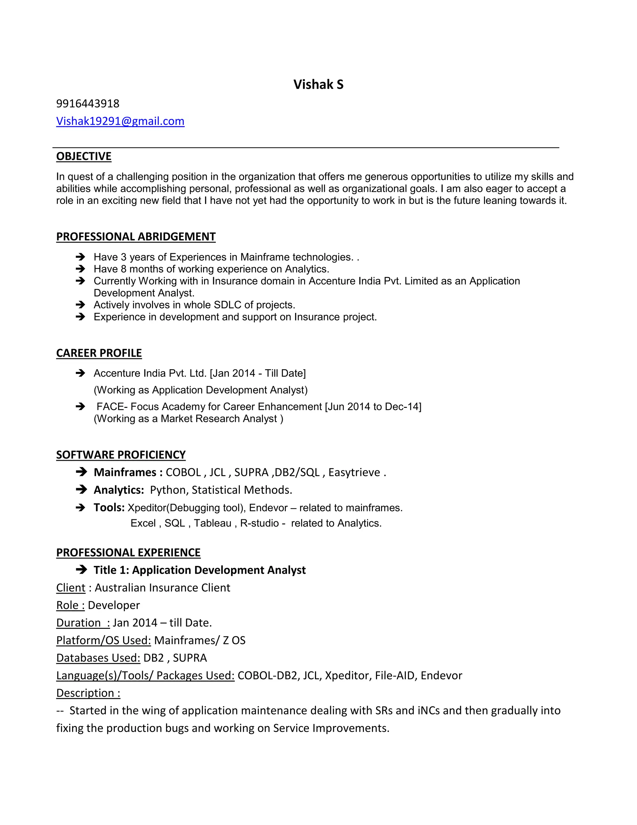 Vishak S is seeking a challenging position that allows him to utilize his skills and experience. He has 3 years of experience in mainframe technologies including COBOL, JCL, and DB2. He currently works as an Application Development Analyst at Accenture India Pvt. Ltd. on insurance projects. He also has experience in data analytics using tools like Python, SQL, and Tableau. He holds a Bachelor's degree in Electronics and Communication Engineering.