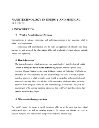 Nanotechnology involves manipulating matter at the nanoscale of 1 to 100 nanometers to develop new materials and devices. It has many applications in energy and medicine. In energy, it can increase solar cell efficiency, improve insulation, and help clean up nuclear accidents. In medicine, it allows more targeted drug delivery, improved diagnostics using sensors, focused radiation therapy for cancer, and antimicrobial applications. Overall, nanotechnology promises revolutionary advances in developing new energy solutions and medical treatments.