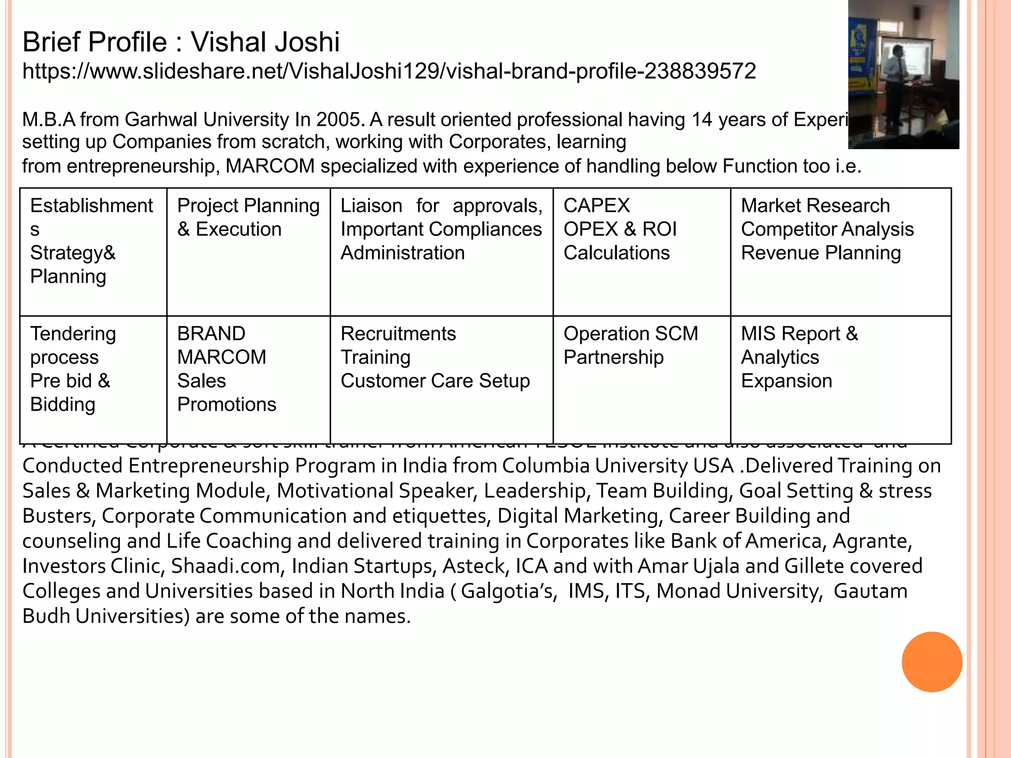 Vishal Joshi is a seasoned professional with 14 years of experience in business establishment and brand communication, holding an MBA from Garhwal University. He has successfully set up and managed organizations, notably launching Smartbike, a public bike-sharing service in Delhi, and has conducted corporate training in various companies and universities across India. His expertise includes brand strategy, event management, and digital marketing, contributing to brand development and marketing success for multiple clients.