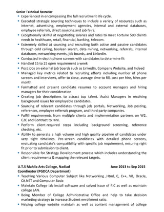 This document contains Vishal Rami's resume. It summarizes his objective as a senior recruiter with extensive experience in staffing and recruiting. It lists his skills including Boolean search, LinkedIn, and Microsoft Office. It details his professional experience as a senior technical recruiter at Tirth InfoTech from 2015 to present where he conducted phone screens, sourced candidates, and fulfilled staffing requirements. It also lists his education including an MSc in Information Technology and BCA from Dharmsinh Desai University.