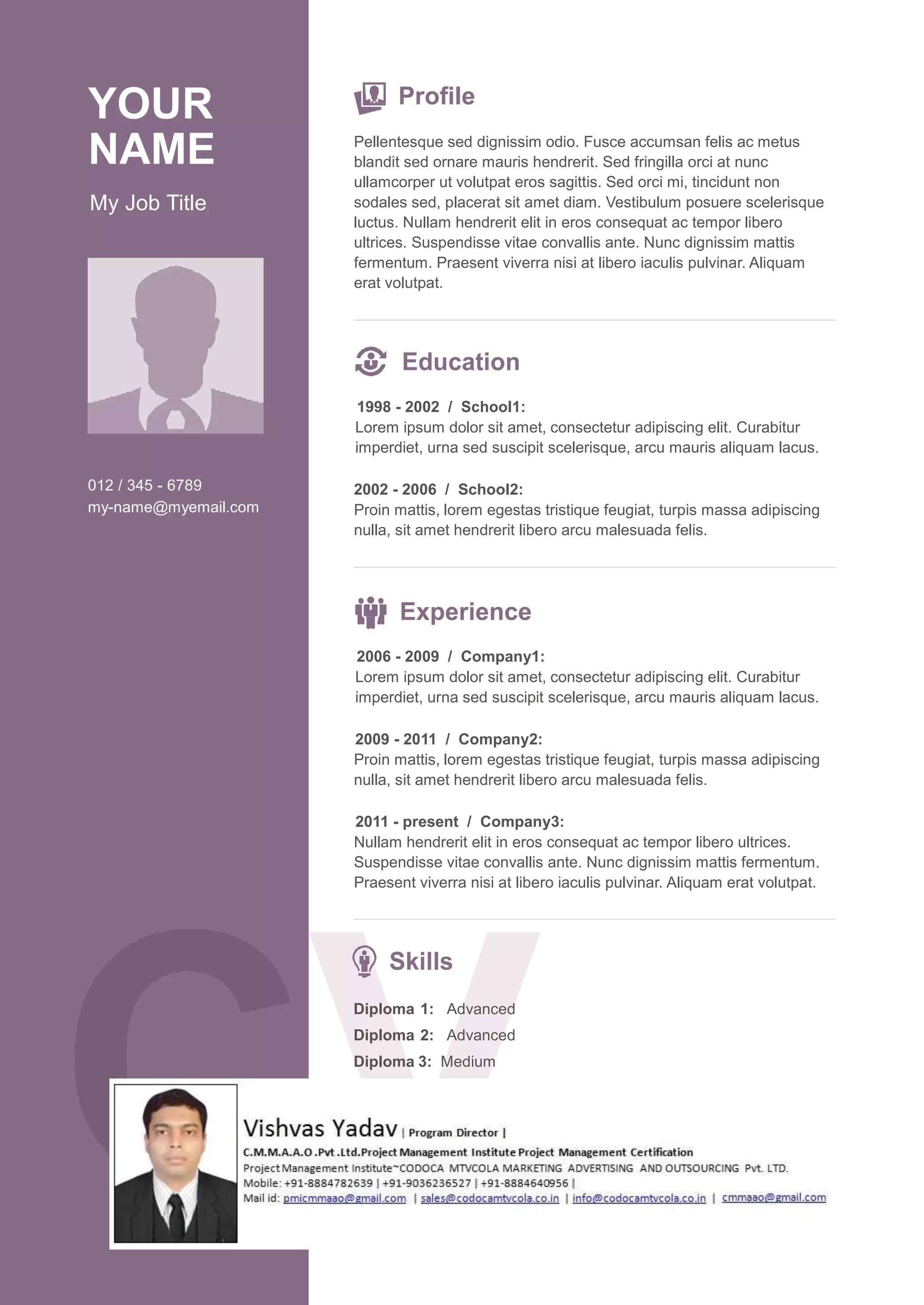 The document appears to be a resume or CV for an individual named [NAME]. It includes sections for personal details, education history from 1998-2006, work experience from 2006-present, skills, and contact information. The resume lists multiple degrees and diplomas as well as experience at several companies. It provides details on the person's qualifications, background, and credentials.