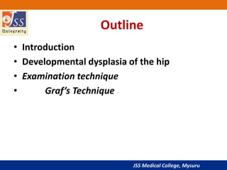 This document discusses using ultrasound to evaluate infant and child hips. It begins with an introduction on the history and effectiveness of hip ultrasound. It then covers developmental dysplasia of the hip, including risk factors, pathophysiology, and ultrasound examination techniques like Graf's method. The document discusses using ultrasound to detect hip effusions, subluxation, dislocation and monitor treatment. It emphasizes ultrasound is very accurate for detecting developmental dysplasia of the hip in infants under 1 year old.