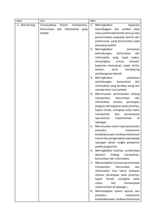 Dokumen ini menjelaskan visi dan misi beberapa kota dan kabupaten di Indonesia dalam mengembangkan sistem transportasi, komunikasi, dan informatika yang handal. Setiap daerah memiliki tujuan spesifik seperti meningkatkan pelayanan publik, menciptakan kondisi lalu lintas yang aman, dan meningkatkan kehandalan operasional sistem. Langkah-langkah strategis yang diusulkan mencakup perencanaan, pengembangan sarana dan prasarana, serta peningkatan profesionalisme aparatur terkait.