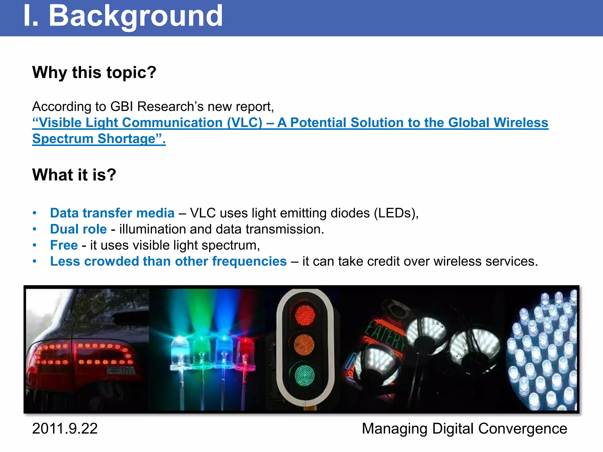 Visible Light Communication (VLC) uses visible light spectrum for data transmission and illumination simultaneously. It has advantages over wireless technologies like free spectrum, high security, and no health hazards. VLC works by modulating the light intensity of LED bulbs to transmit data. Researchers have demonstrated transmitting high definition video through a table lamp. The VLC industry is expected to grow rapidly as LED lighting becomes more widespread. Challenges include increasing data rates and providing bidirectional communication.