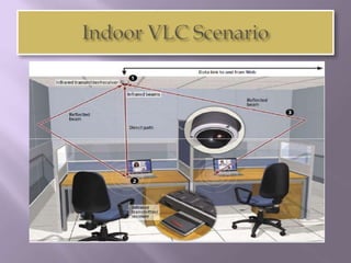 The document discusses visible light communication (VLC) technology. VLC utilizes visible light sources like LEDs to transmit data through the air to photodiodes. It has a history dating back to the late 1990s and the Visible Light Communication Consortium was established in 2003 to promote standards. The VLC process involves LED or fluorescent light transmitters that can be modulated, and photodiode receivers. VLC offers advantages like high data rates, unlicensed spectrum, and security, but also has limitations like short range and limited transmission power. Potential applications include indoor positioning, retail environments, transportation systems, and wireless networking and audio.