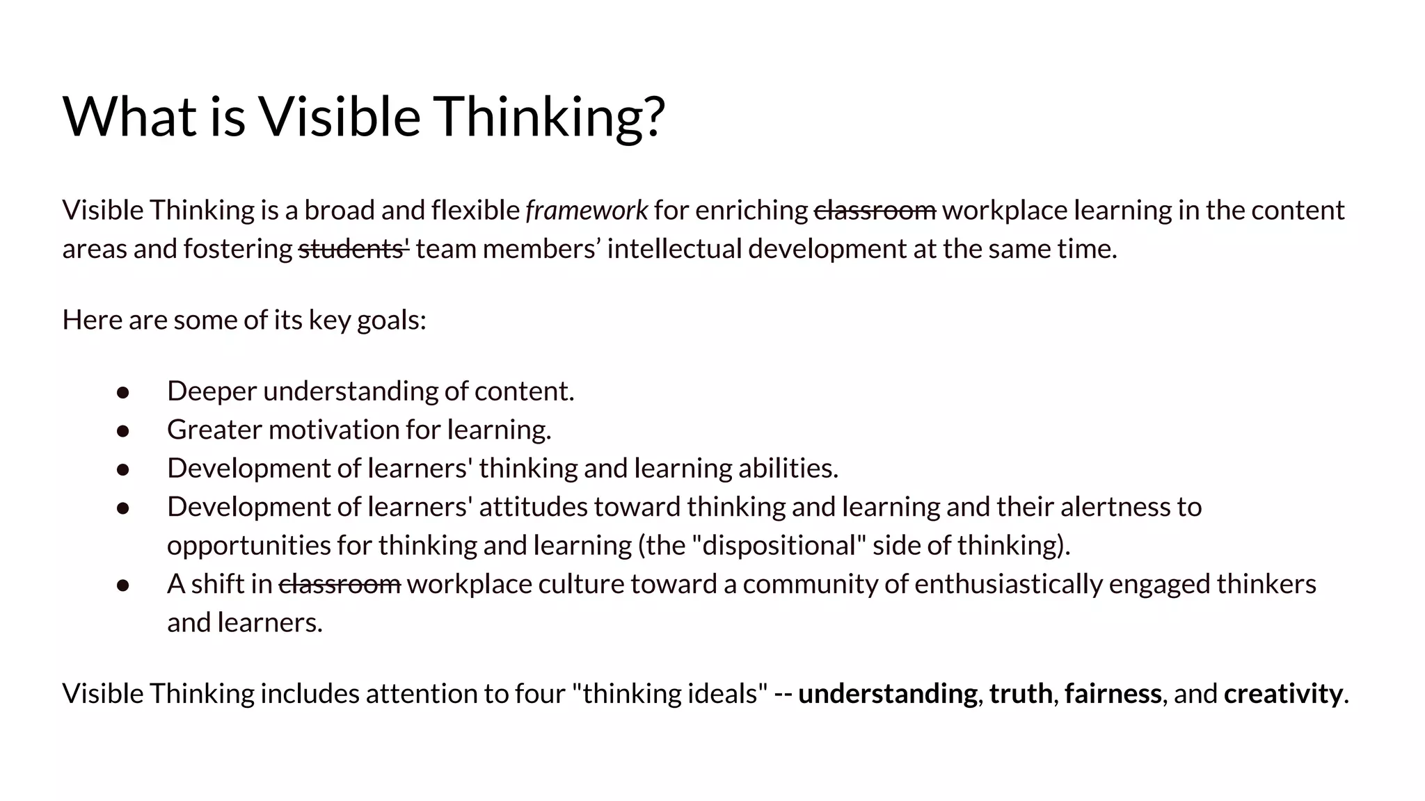 Visible Thinking is a flexible framework aimed at enhancing learning by making students' thinking processes visible, promoting deeper understanding, motivation, and positive attitudes toward learning. It emphasizes the importance of abilities, alertness, and attitudes in effective thinking and incorporates various routines to facilitate thoughtful engagement in classrooms. The framework encourages a culture of collaborative thinkers and learners, utilizing methods that foster diverse perspectives and reflective thinking.