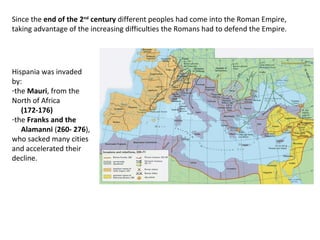 The Visigothic Kingdom ruled Hispania (modern Spain and Portugal) from 416 to 711. It began when the Visigoths, a Germanic people originally from Eastern Europe, were invited by the Romans to expel other barbarian groups from the Iberian Peninsula. Over time, the Visigoths established control over most of Hispania and unified the territory through religious and legal conversions in the 6th-7th centuries. However, internal conflicts and challenges to royal authority weakened the kingdom prior to its conquest by the Umayyad Caliphate in 711.
