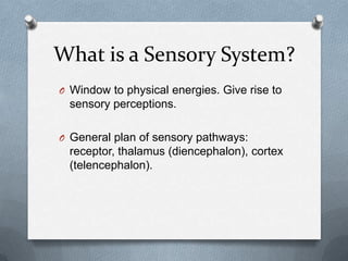 The document discusses the human sensory system, specifically vision. It describes the basic anatomy of the eye, including structures like the iris, cornea, lens, retina, and different types of light receptors (rods and cones). It explains how light enters the eye and is focused on the retina to form an image, which is then transmitted via the optic nerve to the brain for processing and perception of vision. The document also discusses monocular and binocular vision, and how the eye works as a complex optical system to collect light and regulate intensity.