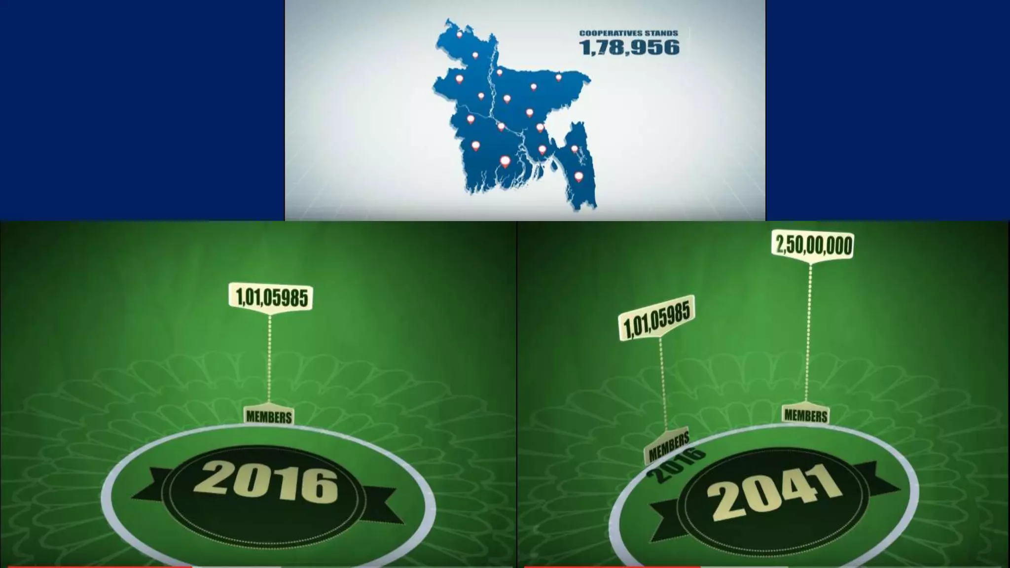 The document outlines a vision for cooperatives in Bangladesh by 2041, where cooperatives are businesses owned and directed by members that contribute significantly to the GDP. The vision includes cooperatives improving agricultural development and village homes through digitalization, introducing a central information system and modernizing operations with smart cards, self-made products, online registration, and connecting internationally to empower women through technology and realize the dream of a cooperative Bangladesh.