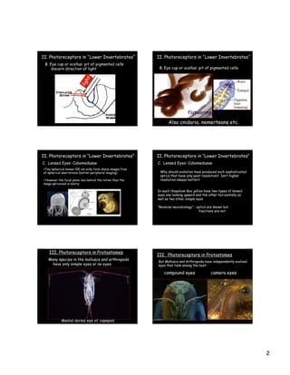 This document discusses the evolution of photoreception and vision. It describes the different types of photoreceptor cells and eyes that evolved in lower invertebrates including pigmented epithelia in corals, eye cups in flatworms, and lensed eyes in cubomedusae jellyfish. It then focuses on the advanced camera eyes that evolved independently in molluscs like cephalopods and the compound eyes of arthropods. The evolution of eyes is considered one of the best examples of convergent evolution, with estimates that eyes evolved over 40 times across different phyla utilizing similar genetic regulatory mechanisms.