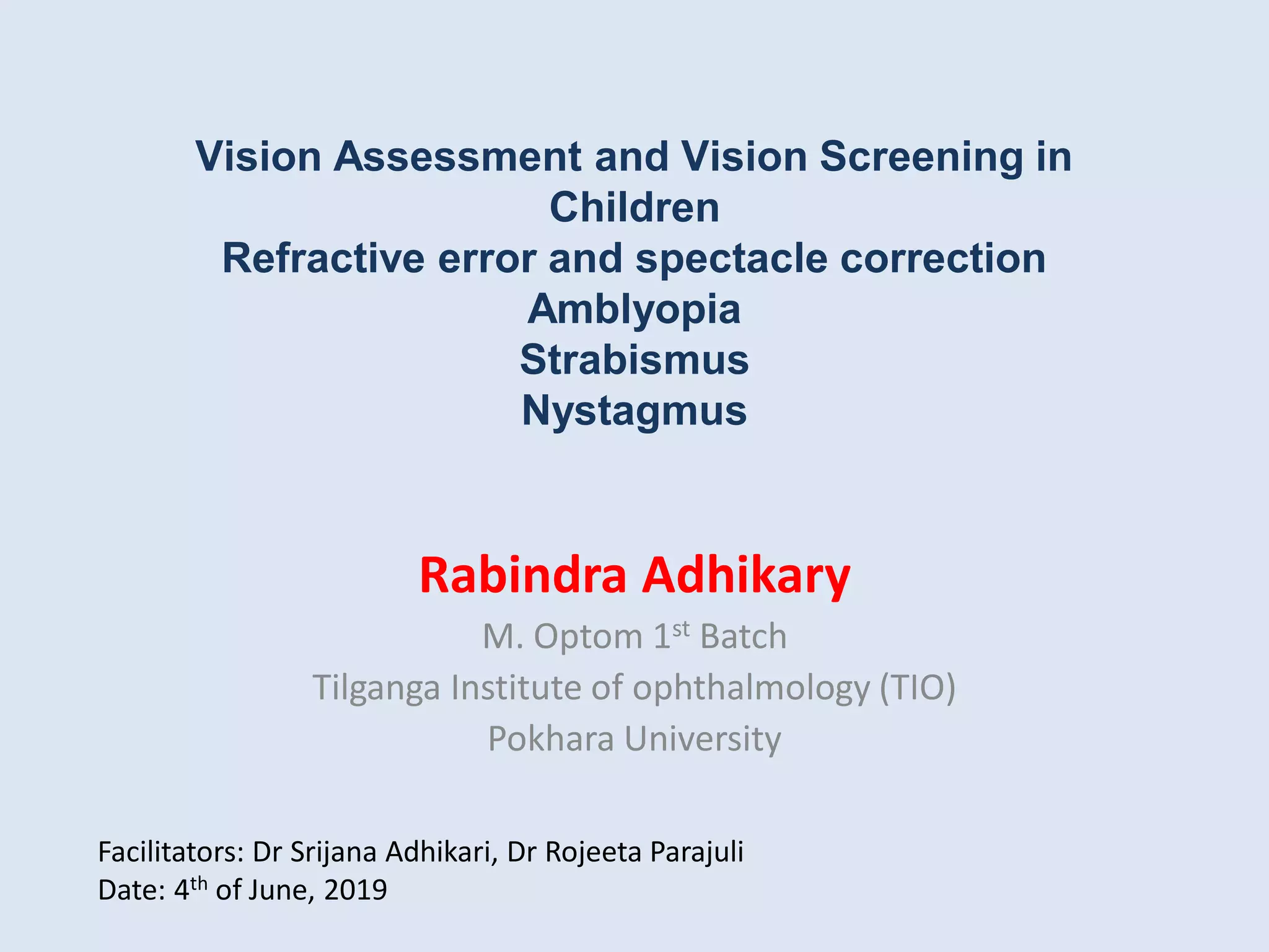 This document provides a comprehensive overview of vision assessment and screening in children, detailing various visual conditions such as refractive errors, amblyopia, strabismus, and nystagmus. It outlines age-specific visual milestones, assessment techniques, and corrective measures for different visual impairments. Additionally, it discusses the implications of these conditions on pediatric eye care and the importance of prompt diagnosis and treatment.