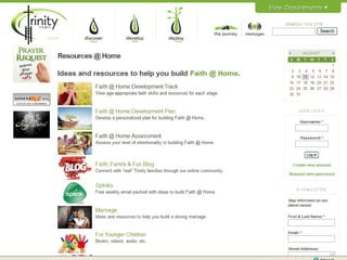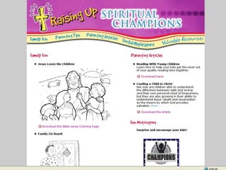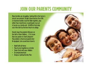 The document discusses building faith in the home. It notes that spiritual life in the home is almost non-existent, yet parents have the greatest influence on children's faith development. The mission is to build faith at home, with the goal of 40% of families placing Christ at the center of their lives. This will be accomplished by equipping parents and building community to support building faith in the home.