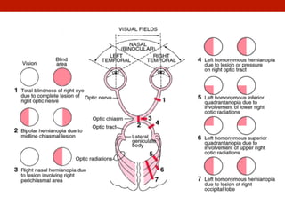 This document discusses vision deficits that can occur after a stroke and how occupational therapists can incorporate vision screening and interventions into inpatient rehabilitation. Approximately 55% of patients in rehabilitation have strokes, which can cause visual field loss, visual perceptual impairments like diplopia or neglect, and other issues. Assessments like the Brief Vision Screen can identify patients' visual concerns. Interventions may include visual scanning exercises, use of prisms or occlusion for diplopia, positioning items on the affected side, and adapting the level of support based on cognition. Continued research is needed on assessment tools and addressing vision can benefit patients' functional recovery.