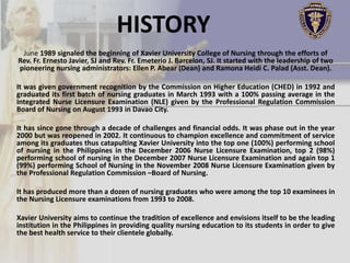 The document summarizes the history and mission of Xavier University College of Nursing. It began in 1989 under the leadership of two deans. It was recognized by the Commission on Higher Education in 1992 and graduated its first batch in 1993, who achieved a 100% passing rate on licensing exams. While it faced challenges and closed briefly in 2000, it reopened in 2002 and has since produced top-performing graduates on licensing exams. Its vision is to be a leading nursing education institution providing excellent healthcare. Its mission is to provide holistic, community-oriented education to develop students intellectually and spiritually.