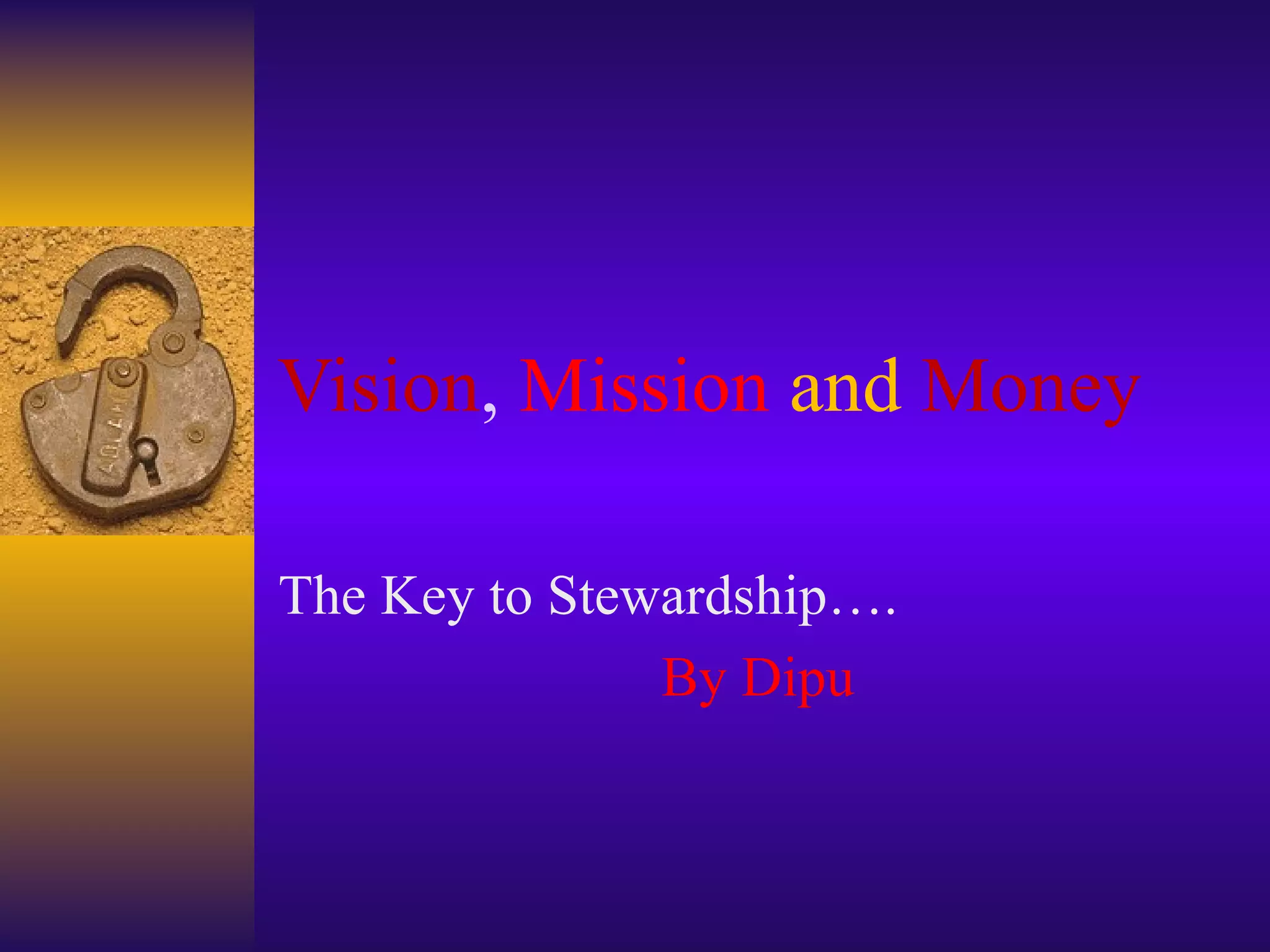 This document discusses the importance of vision, mission, and money in church stewardship. It provides guidance on developing a vision statement, mission statement, and using those statements to evaluate current ministries and budgets to ensure resources are being used to further the church's mission. The document emphasizes regularly communicating the vision and mission to the congregation and using those statements to guide financial planning and fundraising efforts like the annual pledge drive.