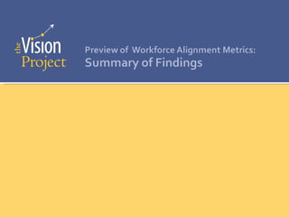 The document summarizes a presentation given at a Board of Higher Education meeting about achieving national leadership in education and research. It discusses goals of increasing college participation and completion rates, student learning outcomes, workforce alignment of degrees produced, and eliminating achievement gaps. It then previews a vision project assessing how well degrees and enrollments align with high-growth occupational fields and workforce needs in Massachusetts through metrics like graduation rates and employment of graduates.