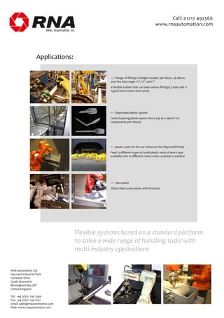 This document provides an overview of RNA Automation Ltd and their robotic and vision guided handling systems. The systems are versatile and can singulate, manipulate, inspect, and place a diverse range of components from bulk materials into downstream equipment. Common applications of the systems include machine loading, batch sorting, and quality inspection. The RNA product range includes robotic systems, vision inspection systems, feeding and handling solutions, and palletizing systems. The robotic systems offer very user friendly programming, fast changeover for different products, and easy integration with production equipment.