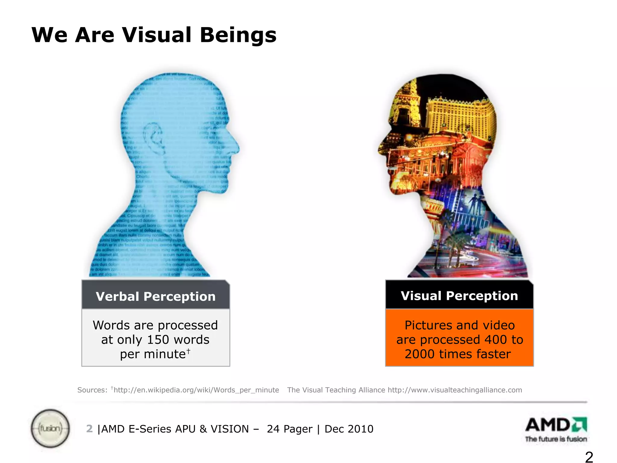 The document discusses AMD's VISION technology, which combines CPU and GPU capabilities on a single chip called an APU. It highlights key benefits of the technology like vivid HD entertainment, fast internet browsing, and accelerated applications. Performance comparisons show AMD APUs outperforming Intel processors on metrics like battery life, graphics performance, and user experience.
