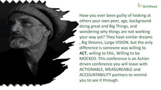 This document discusses holding a conference to provide actionable steps and accountability partners to help attendees achieve their big dreams and visions. It notes that many people have similar dreams but the difference is being willing to act, fail, and be mocked. The conference aims to leave attendees with measurable and accountable next steps. It then provides questions for attendees to reflect on regarding their goals and plans. The rest of the document outlines what attendees will learn, such as understanding customer and competitor needs to build a product from concept to market. It discusses the benefits and risks of bringing ideas to life. Finally, it emphasizes the importance of constant feedback loops and assessment in any project.