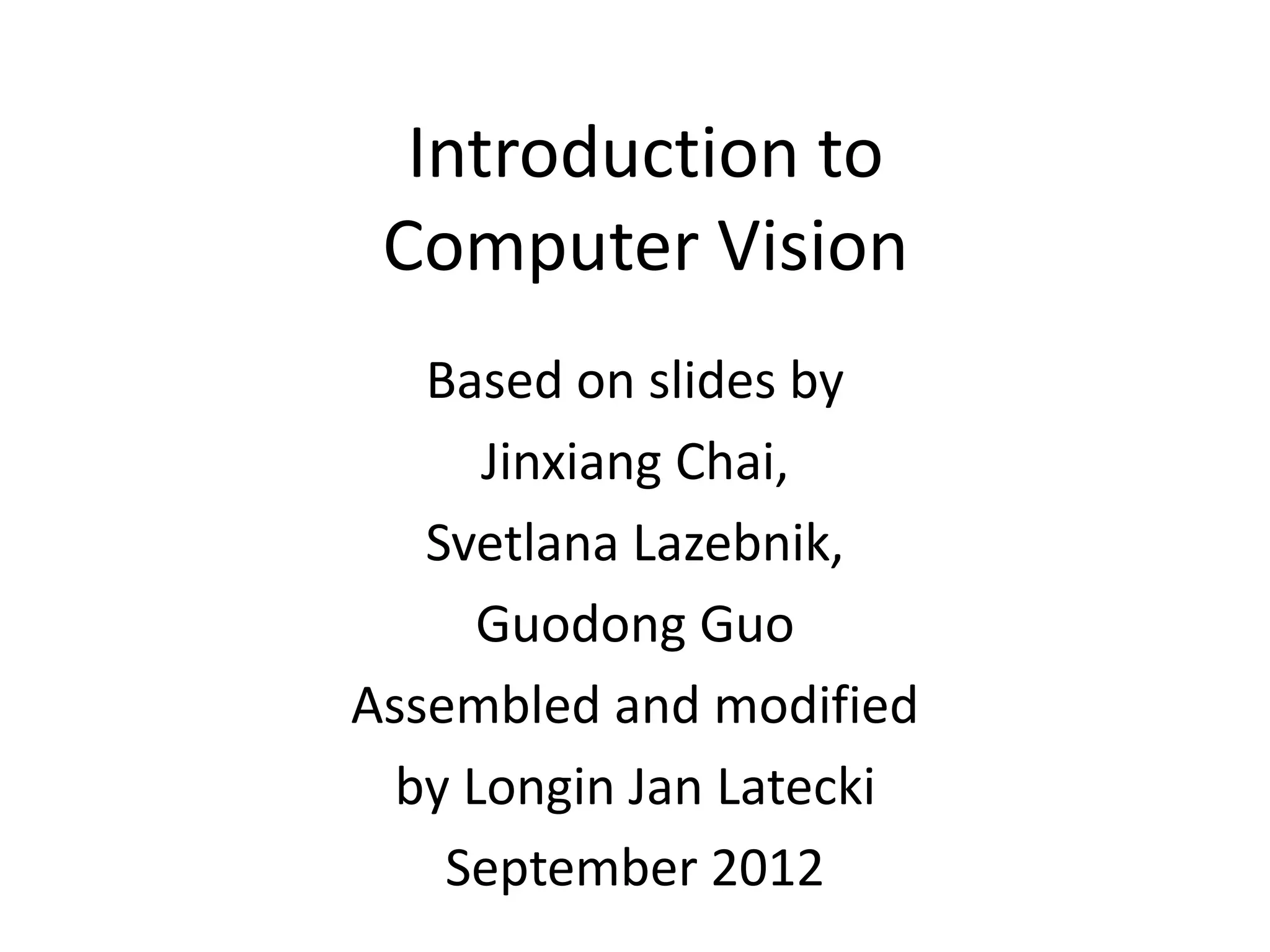 Computer vision is the field of artificial intelligence that teaches computers to derive meaningful information from digital images, videos, and other visual inputs - and to replicate some of the understanding that humans naturally possess. The document provides an introduction and overview of computer vision, including its history, key challenges, applications, and related fields. It also summarizes some of the major components and techniques involved, such as camera modeling, image filtering, segmentation, and shape analysis.