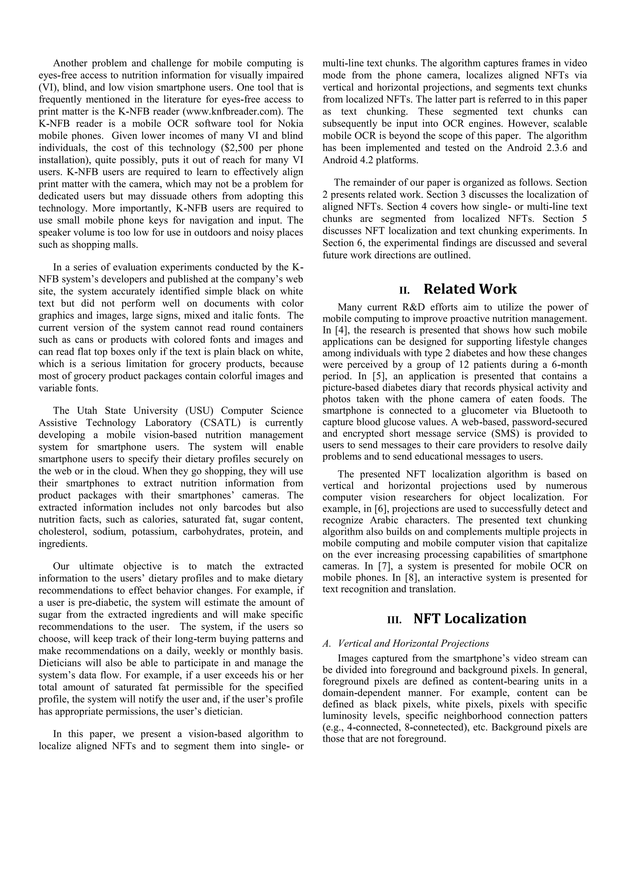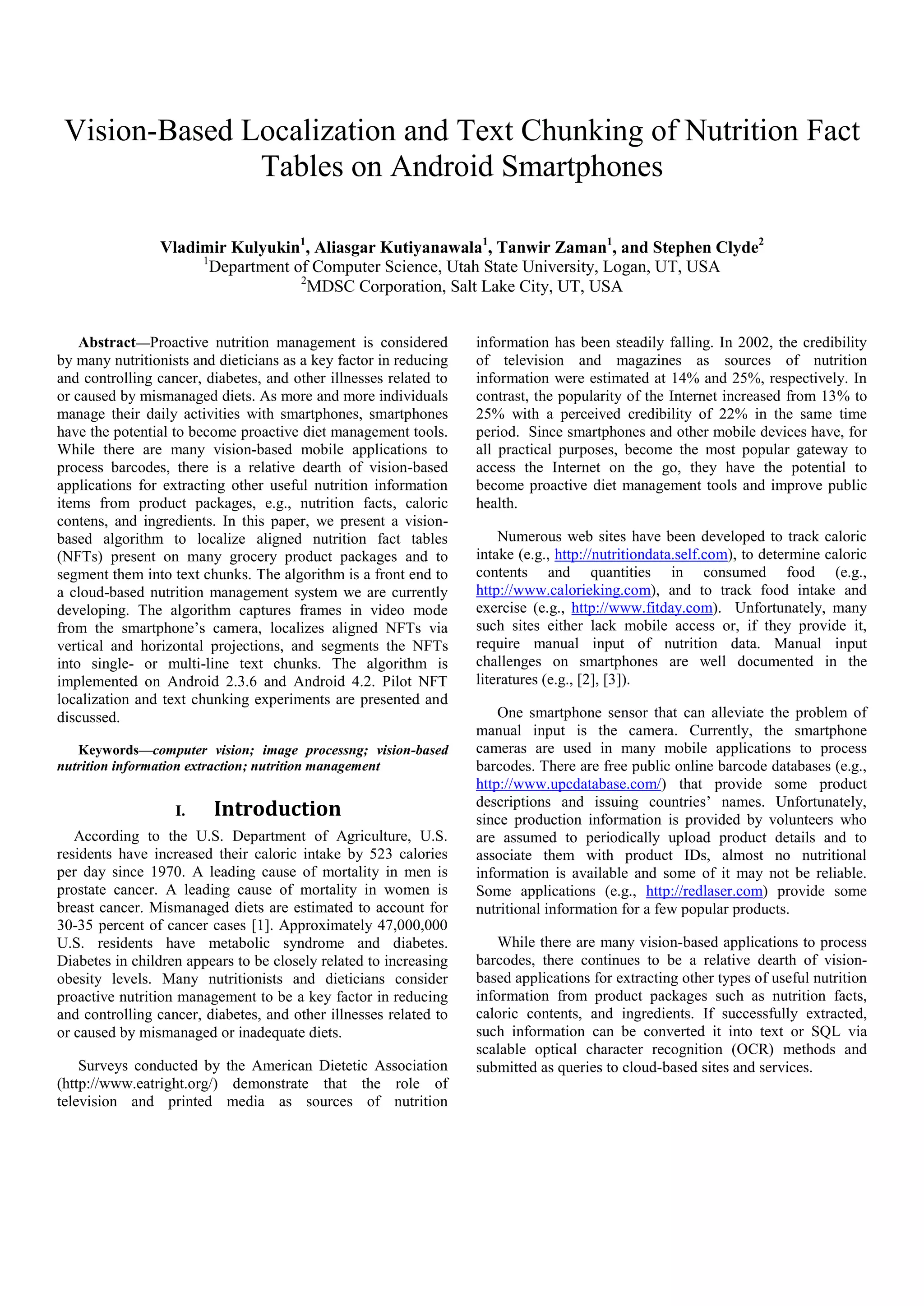 1. The document presents a vision-based algorithm to localize and segment nutrition fact tables (NFTs) on product packages using smartphone cameras. It detects NFTs by identifying horizontal and vertical lines via projections, then segments the localized NFT into single- or multi-line text chunks.