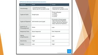 The document summarizes the structure and function of the human eye. It describes the three layers that make up the eyeball - fibrous, vascular and nervous layers. The fibrous layer includes the sclera and cornea. The vascular layer includes the choroid, ciliary body and iris. The nervous layer is the retina. It also explains key parts of the eye like the iris, lens, vitreous humor and aqueous humor. The retina contains photoreceptors that convert light to neural signals sent to the brain via the optic nerve. The visual pathway and common refractive errors are also summarized.