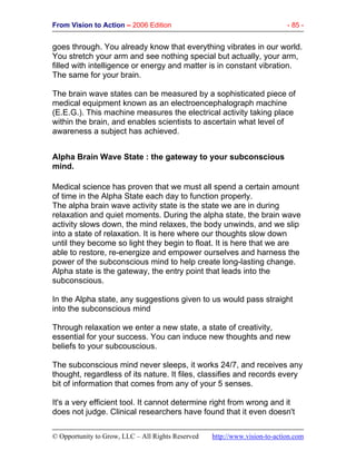 The document discusses the importance of goal setting for achieving success and happiness. It explains that the subconscious mind can be influenced through visualization and autosuggestion to help achieve goals. Specifically, it recommends practicing "imaginary council meetings" where you visualize speaking to heroic role models and asking them to help you develop desired qualities. Regularly repeating this process trains the subconscious mind. The document also discusses entering a relaxed "alpha state" to best influence the subconscious. It notes that setting clear, written goals focuses the conscious mind and allows the subconscious to work towards goals automatically. Statistics are provided showing that goal setters tend to be much more successful and happy than non-goal setters. An NLP goal setting model called