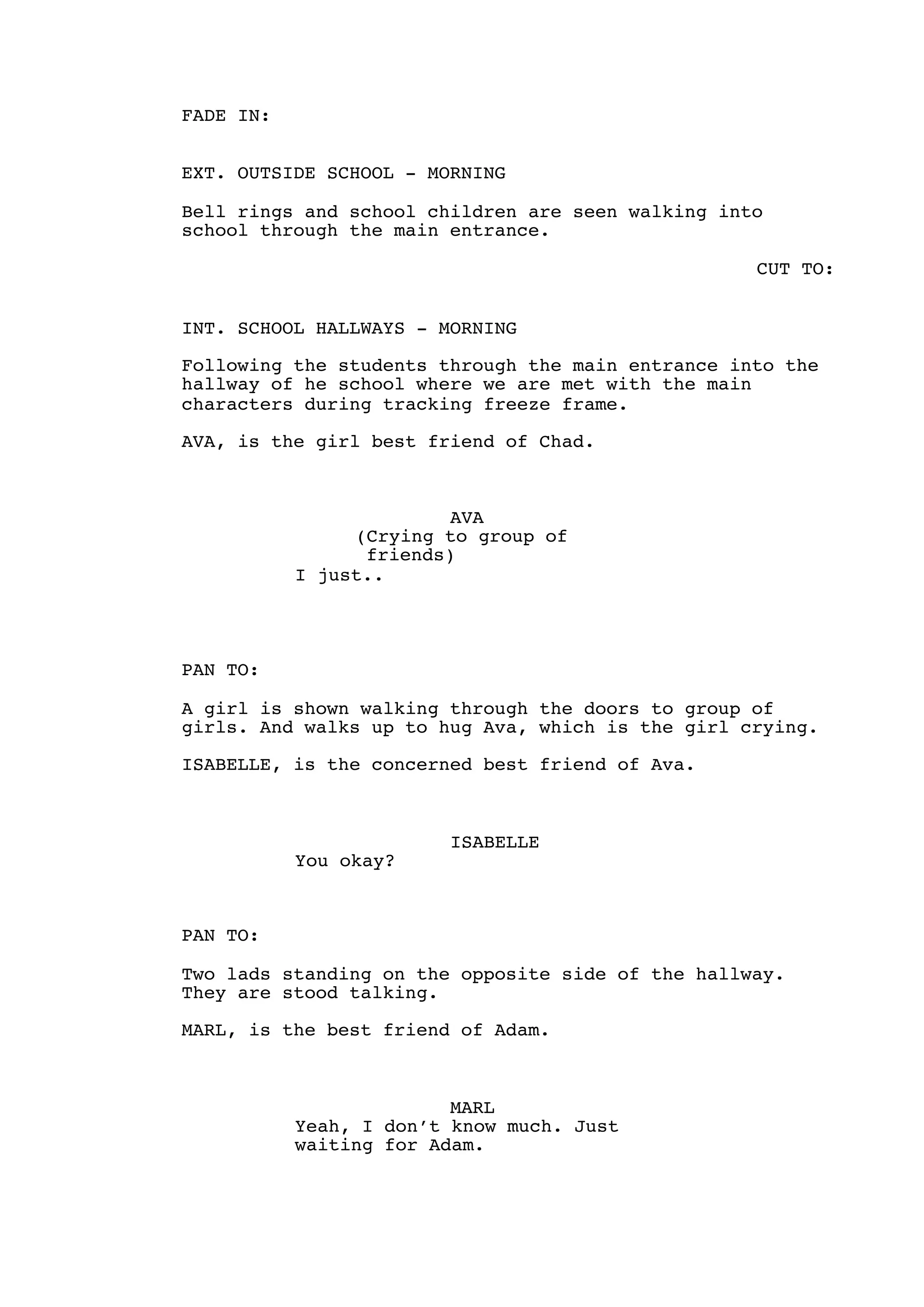 A student named Chad has passed away. In school, Adam and his friends deal with the news of Chad's death. That night, while looking at old photos of himself and Chad, Adam hears strange noises in his house. He investigates and encounters an unknown figure, screaming in terror as the screen cuts to black.