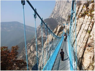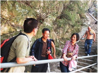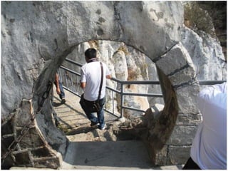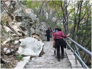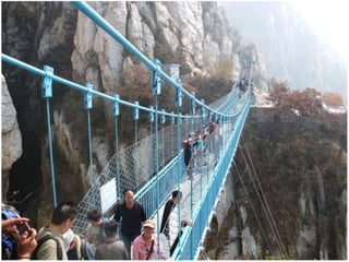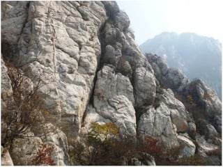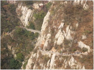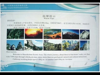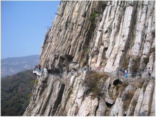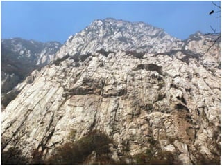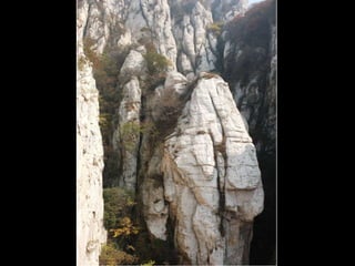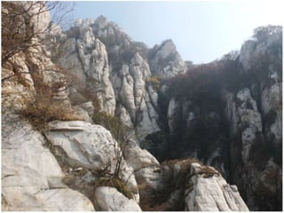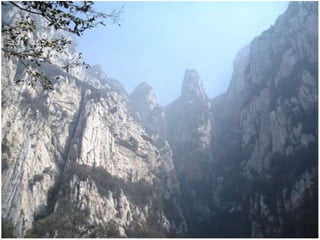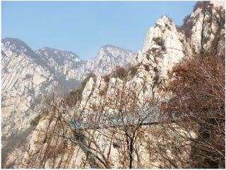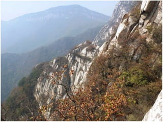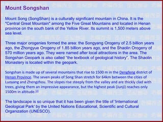 Mount Songshan is a culturally significant mountain located in Henan Province, China. It is 1500 meters above sea level and one of the Five Great Mountains. The landscape was formed by three major geological events over 2.5 billion years. It contains the Shaolin Monastery and has been designated an International Geological Park by UNESCO due to its unique scenery.