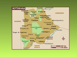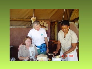 The document summarizes a group's holiday trip to Botswana in 2008. It describes their journey from South Africa to Maun and then to Okuti Camp in Moremi Game Reserve. While at the camp, they went on daily game drives and boat rides. They encountered many wild animals around the camp, including elephants, hippos, and lions. They saw over 50 new bird species. It was Les's birthday during the trip and they had a celebration. At the end of the trip, they returned home safely after experiencing Africa's unique wildlife.