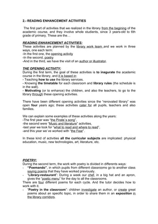 The document describes the activities and objectives of the CEIP Pío XII school library, established five years ago, which operates under a ministry plan that supports its functions and training. It highlights reading enhancement activities for students aged 3 to 11, including author visits, poetry recitals, and family involvement initiatives aimed at fostering a love of reading. Additionally, the library emphasizes its role as a resource center linked to the curriculum, involving parents and the community in various literary programs and encouraging cooperative learning among students.