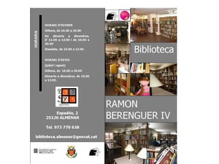 Missió La bibliotecamunicipal d’Almenar proveeix serveis i fons accessibles a tothom, ofereix suport a la formació, informació, lleure i cultura a tots els ciutadans, ciutadanes i entitats d’Almenar. Promou el foment de la lectura per ajudar a entendre el món amb pensament crític, dialogant i poder ser millors.