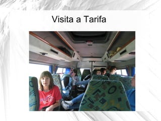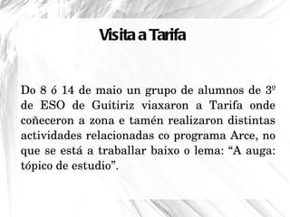 Visita tarifa 1. Visita a Tarifa Do 8 ó 14 de maio un grupo de alumnos de 3º de ESO de Guitiriz viaxaron a Tarifa onde coñeceron a zona e tamén realizaron distintas actividades relacionadas co programa Arce, no que se está a traballar baixo o lema: “A auga: tópico de estudio”. 2. 3. 4. 5. 6. 7. 8. 9. 10. 11. 12.