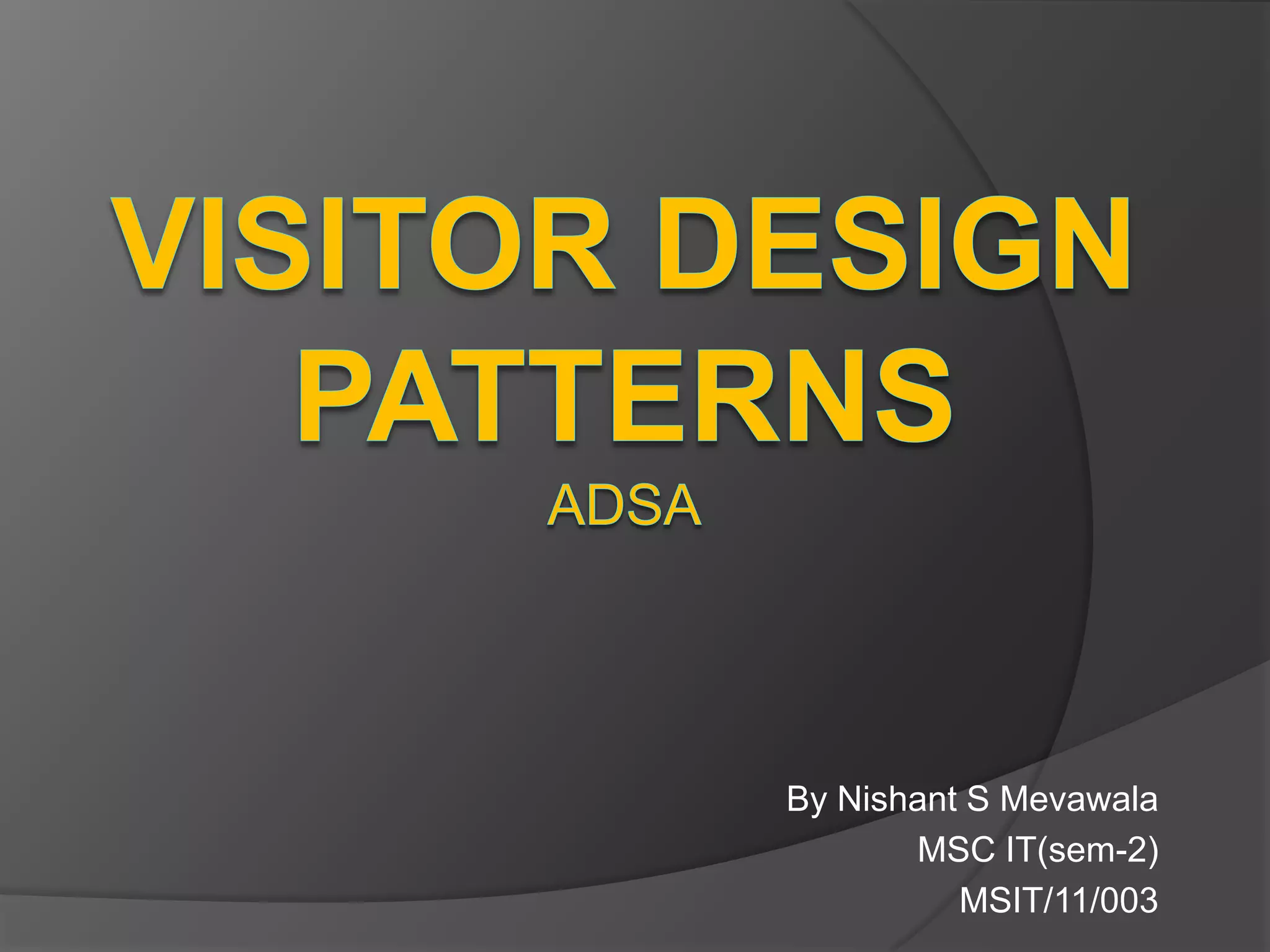 This document discusses the visitor design pattern. The visitor pattern represents an operation to be performed on elements of an object structure without changing the classes of the elements. It is useful when adding new operations to an object structure like an abstract syntax tree that contains many node types. With the visitor pattern, each node type accepts a visitor object that contains operations specific to that node type, rather than putting operations directly in each node class. This avoids changing node classes when adding new operations and separates operation code from class code for better structure and maintenance.