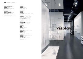 This document provides an overview of Visplay modular display systems installed in various retail stores around the world. It includes 3 sentence descriptions of dozens of store projects, categorized by type of store (Department Stores, Fashion, Health & Beauty, etc.). Each project listing includes the store name and location, opening date, and Visplay systems used. The document acts as a showcase for Visplay's modular retail solutions implemented globally.