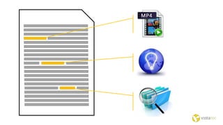 The document discusses the Internet of Things and natural language processing. It describes how Vistatec has integrated various natural language processing tools, linguistic resources, and knowledge graphs to automatically enrich content. This reduces effort for authors while delivering more discoverable, interactive, and intelligent content for customers. Content enriched by Vistatec's techniques is optimized for discovery, can be interacted with, and is prepared for the Internet of Things.