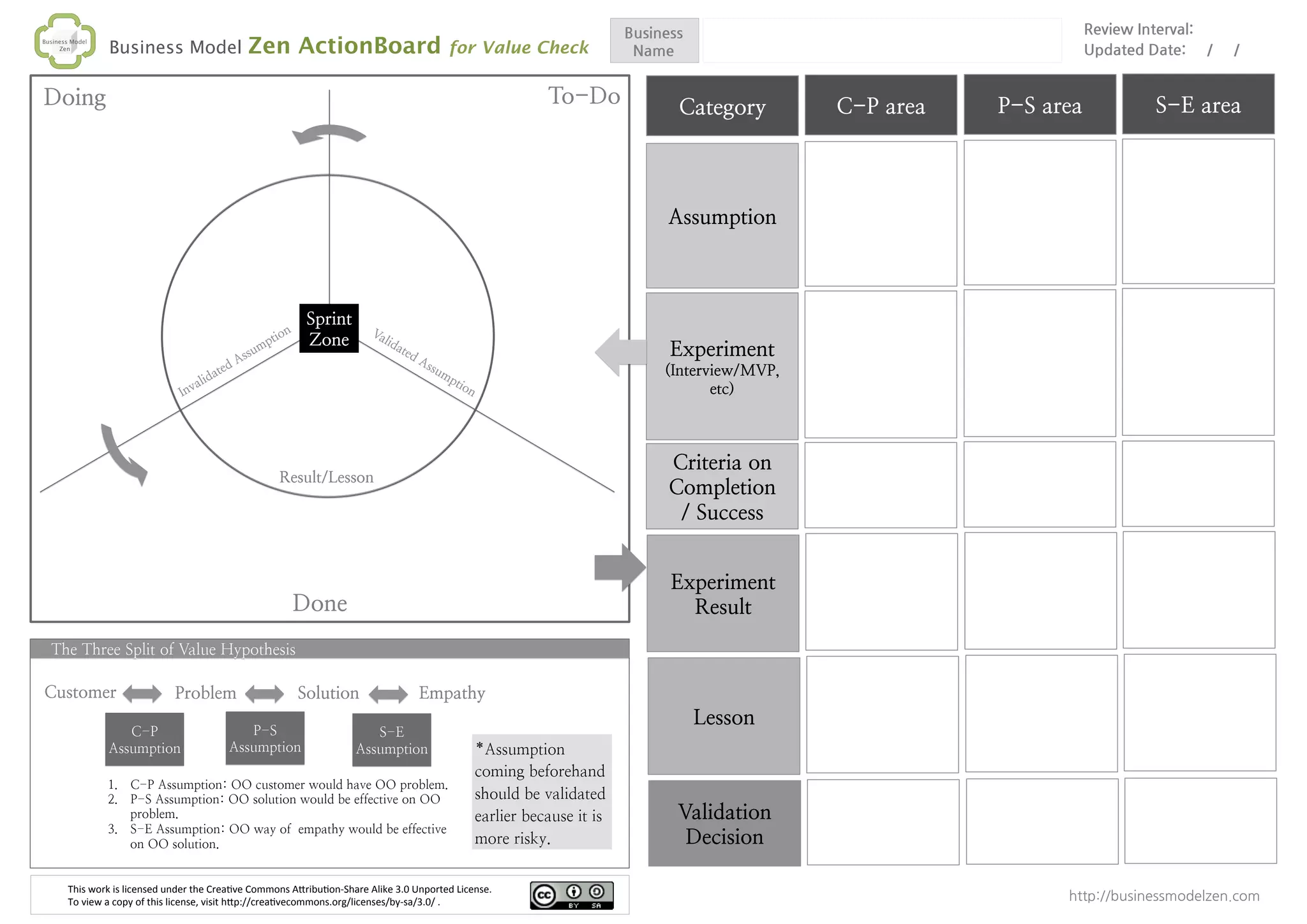The document outlines a framework for validating business assumptions through experiments such as interviews or MVPs. It identifies three key assumptions related to customer problems, effective solutions, and empathy, which should be tested to reduce risk in decision-making. The information is presented in the context of a business model evaluation and includes a reference to Creative Commons licensing.