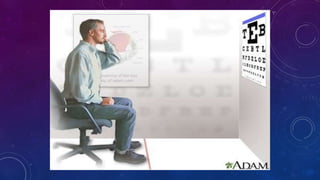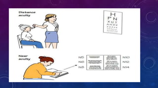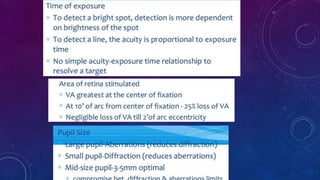 Visual acuity is a measure of the eye's ability to see fine detail and discriminate between objects. It is assessed using charts with letters, symbols, or pictures of decreasing size. The Snellen chart is commonly used, with visual acuity recorded as the distance at which a person can see a symbol subtending an angle of 5 minutes of arc. Other methods include the Landolt C chart and LogMAR chart. Visual acuity depends on factors like stimulus characteristics, retinal location stimulated, and optical elements of the eye. It provides information on visual function, refractive status, and outcomes of treatments.