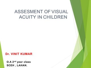 The document discusses the assessment of visual acuity in children, defining it as the eye's resolving power to see separate objects. It details various methods for testing visual acuity at different ages, including techniques such as preferential looking tests and visual evoked potentials, while also outlining normal developmental milestones for visual acuity. The conclusion emphasizes the challenges in measuring acuity in infants and the importance of correcting for refractive errors.