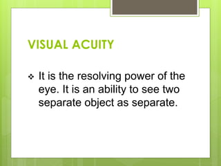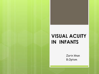 This document discusses methods of measuring visual acuity in infants. It describes that visual acuity improves rapidly in the first years of life and matures around 5-6 years old. Several tests are mentioned, including optokinetic nystagmus testing, preferential looking tests, visually evoked responses, Cardiff acuity card tests, and observation of fixation behavior. Normal visual development milestones from birth to age 5 are provided. The document gives details on different visual acuity tests used with infants, such as the optokinetic nystagmus test, preferential looking test, and Lea paddle test.