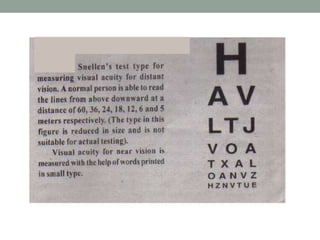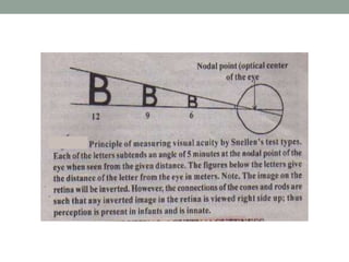 2. It defines visual acuity as the minimum angle two lines can be separated and seen individually, which is 1 minute for a normal eye. Visual acuity is measured using Snellen charts.