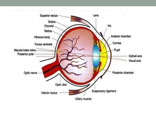 3. Key structures of the eye are described like the lens, changes in the lens with age like presbyopia and cataract. Cataract treatment involves surgically removing the cloudy lens and replacing it with an IOL.