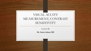 The lecture by Dr. Sania Aslam discusses visual acuity measurement and contrast sensitivity, explaining the principles and clinical tests used to assess visual acuity, including Snellen's test, Landolt's test, and near vision tests. It details the components of visual acuity such as detection, resolution, and recognition, along with methods for testing both adults and children. Additionally, it highlights how visual acuity is expressed in various grading systems like Decimal Acuity and LogMAR.