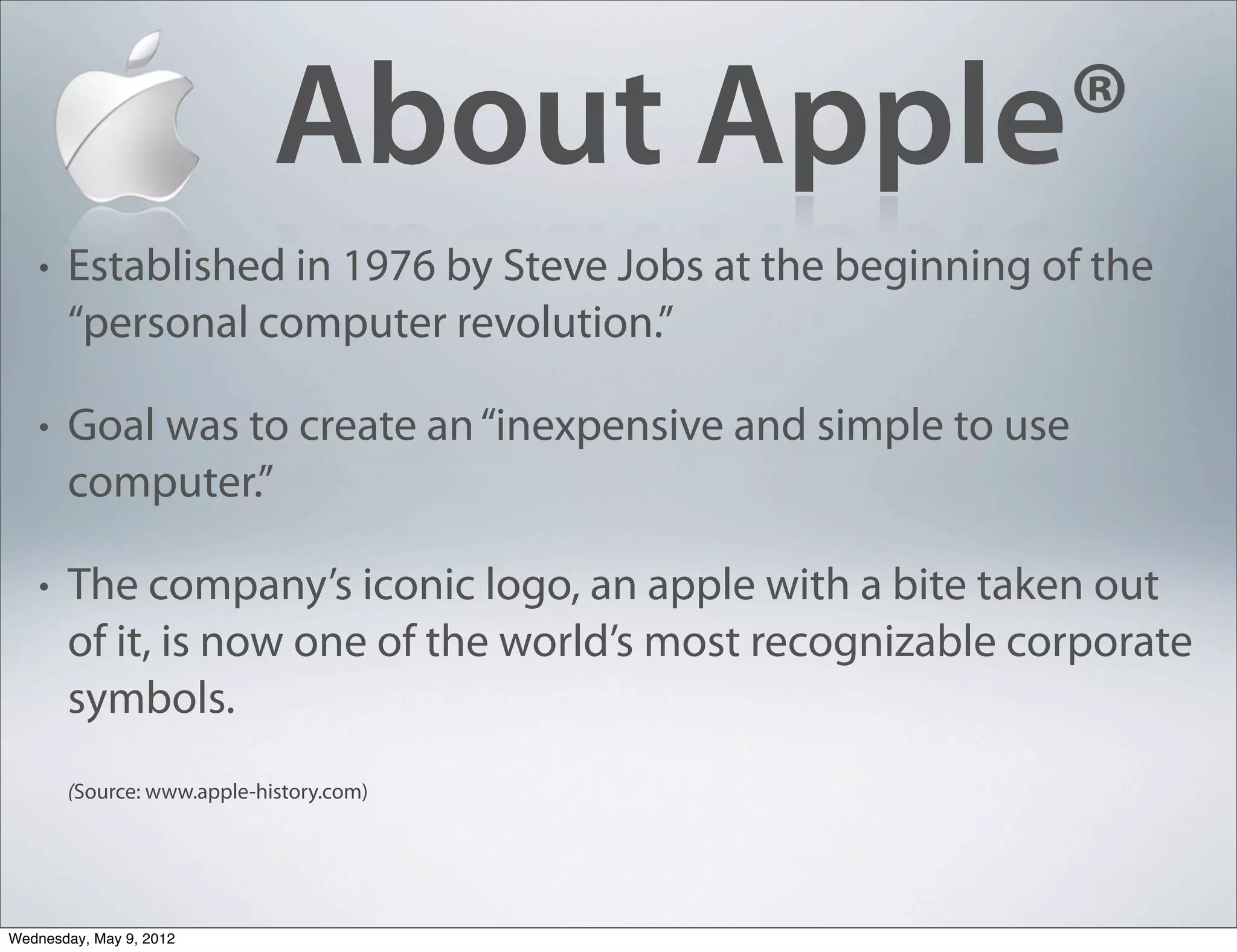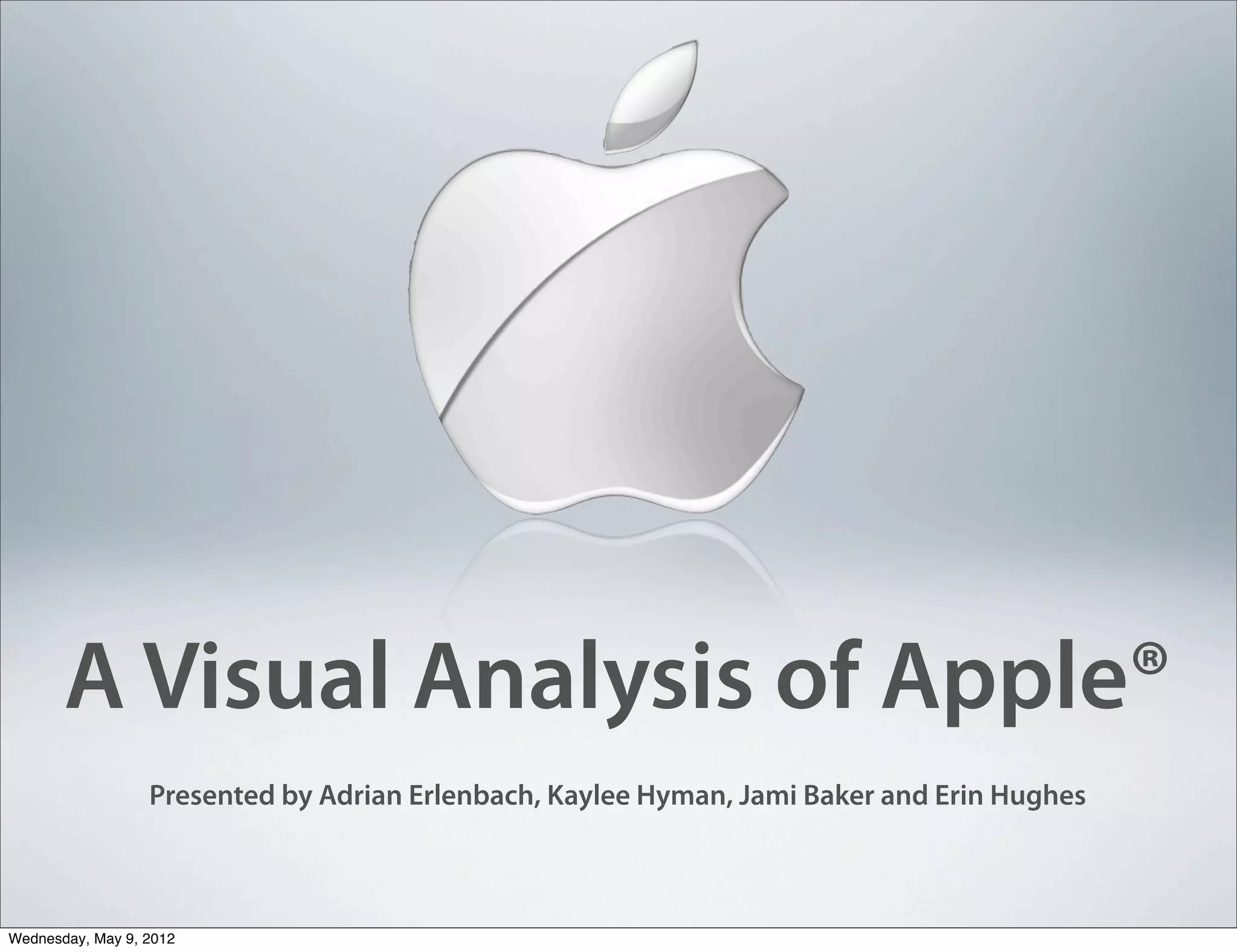 The document presents a visual analysis of Apple, detailing its history, logo evolution, and branding strategies. It highlights Apple's mission to deliver innovative computing experiences and critiques its branding for being exclusive to certain demographics. The proposal suggests that Apple should adopt more diverse and approachable advertising to connect with a broader audience, particularly those feeling alienated by its current image.