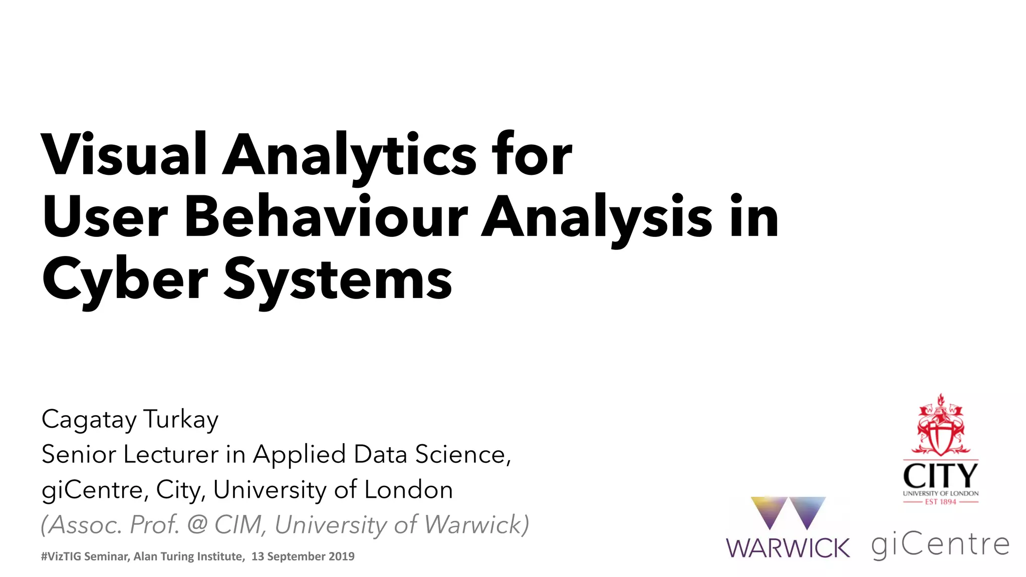 The document presents a seminar by Cagatay Turkay on visual analytics for user behavior analysis in cyber systems, highlighting the importance of combining visual and computational analysis. It details a case study on interactive user behavior analytics (Vasabi) that tracks user actions over 31 days, focusing on how visual analytics can provide a comprehensive understanding of user behavior. The study emphasizes the need for human-centered approaches in data-intensive decision making to enhance the evaluation and context of algorithmic results.