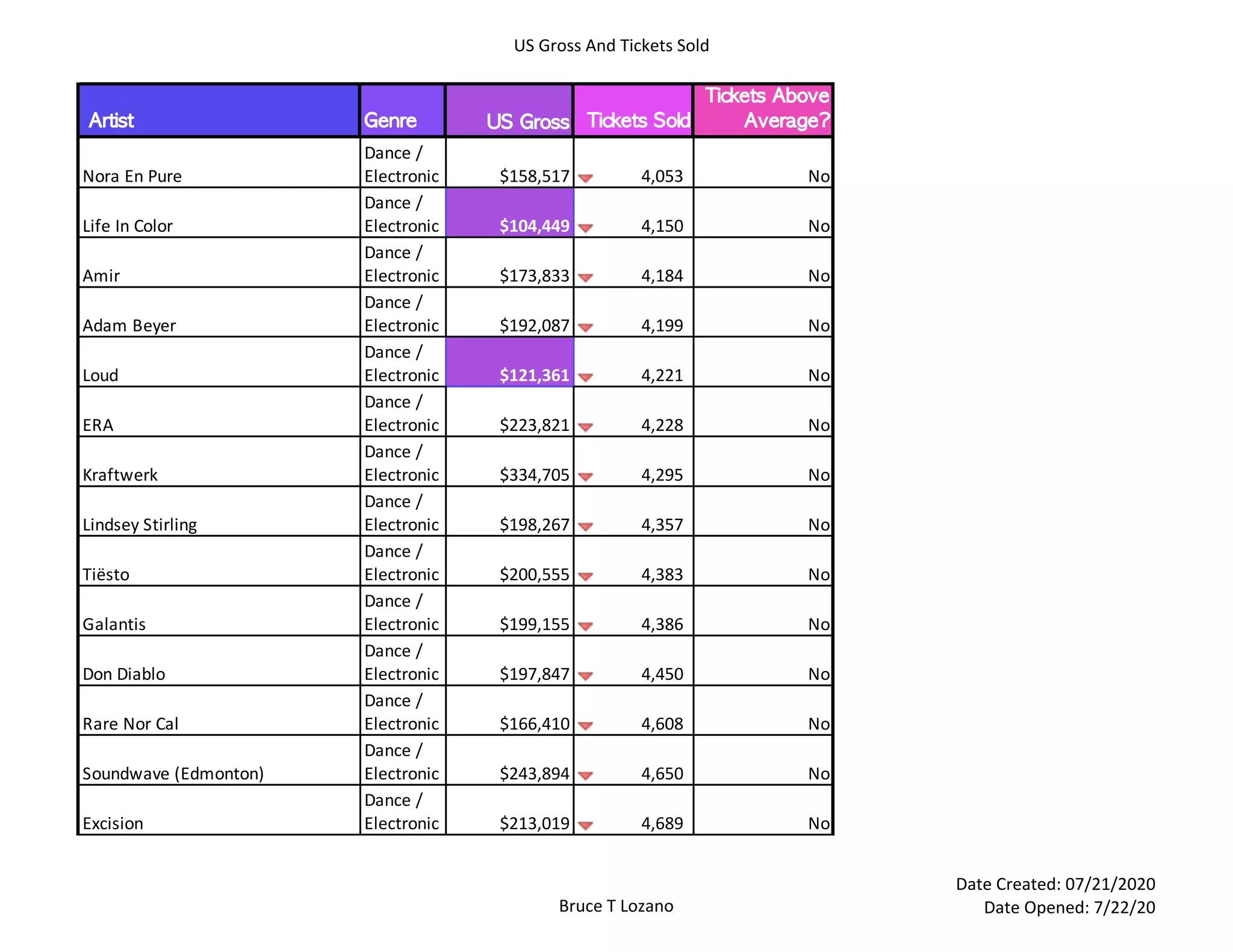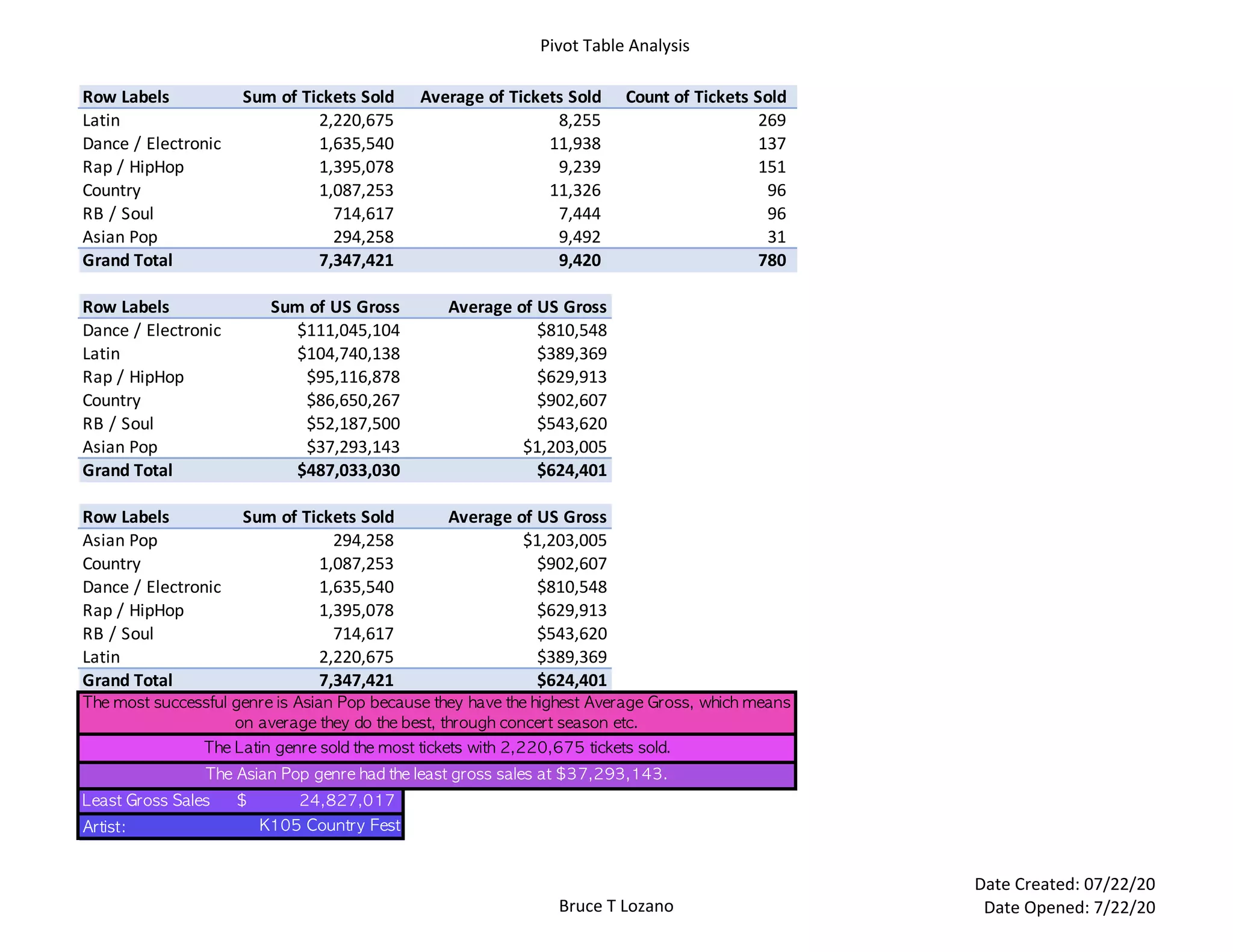 The document presents a pivot table analysis of ticket sales and gross revenue for various music genres, highlighting that Latin music had the highest ticket sales with 2,220,675 tickets sold, while Asian pop generated the highest average gross per ticket. The total U.S. gross across genres amounted to $487,033,030. Notably, the world club dome event had the highest gross sales of $24,827,017 with 160,625 tickets sold.
