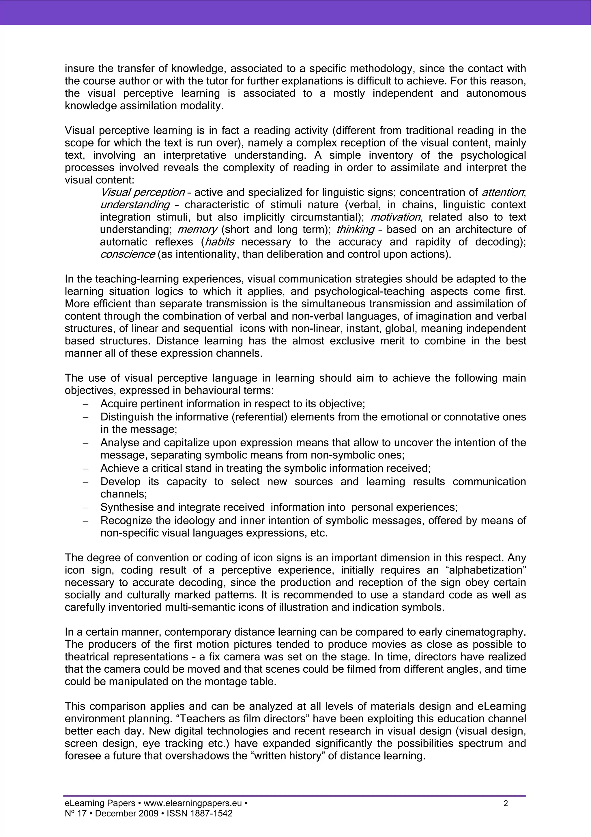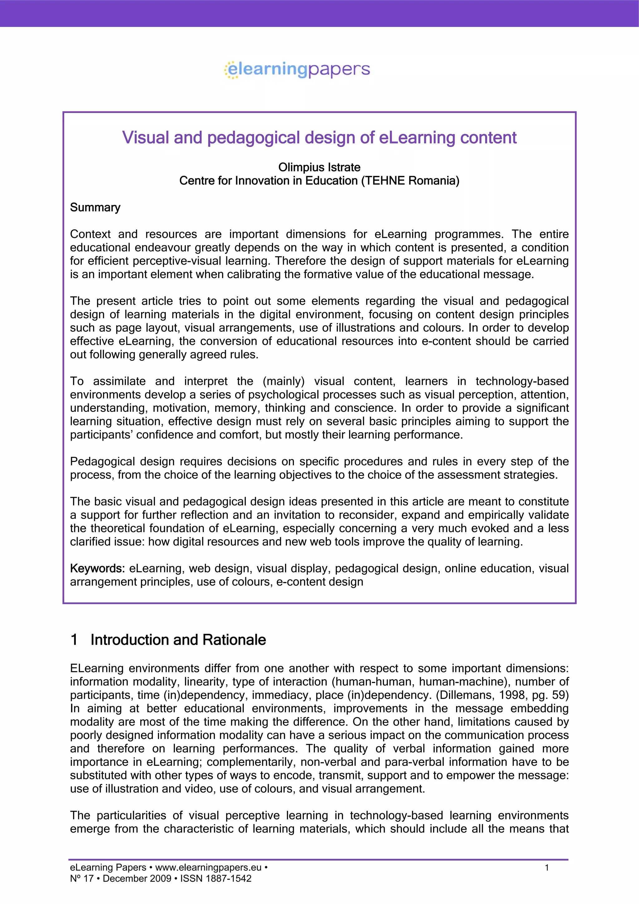 The document discusses the significance of visual and pedagogical design in e-learning content, emphasizing the importance of how educational materials are structured and presented to enhance learning experiences. It highlights principles such as page layout, visual arrangements, and the integration of multimedia elements while stressing the need for effective design to promote cognitive processes in technology-based learning environments. Additionally, it outlines several key strategies for the creation and assessment of e-learning materials, aiming for improved educational outcomes.