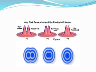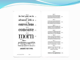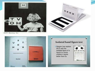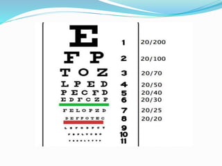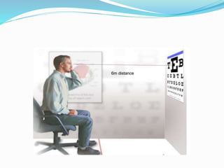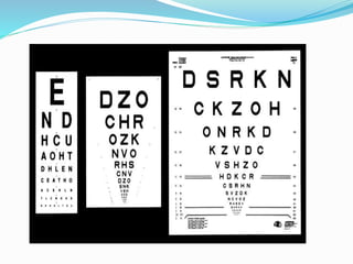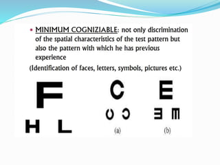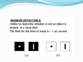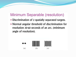This document discusses various aspects of visual acuity and its measurement. It defines visual angle and visual acuity, and describes the receptor theory and Rayleigh criterion for visual resolution. It outlines the components involved in measuring vision, including visual acuity, field of vision, color vision and more. Methods for testing visual acuity are provided for both distance and near vision for adults and infants. Factors that can influence visual acuity measurements are also summarized.